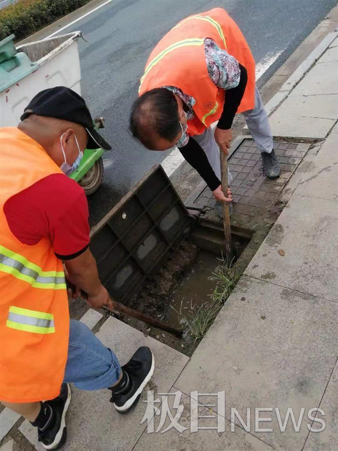 8月21日,径河街城管所再次清洗路面淤泥、进行日常大消杀,清理下水井盖落叶和淤泥,及时修补破损路面。