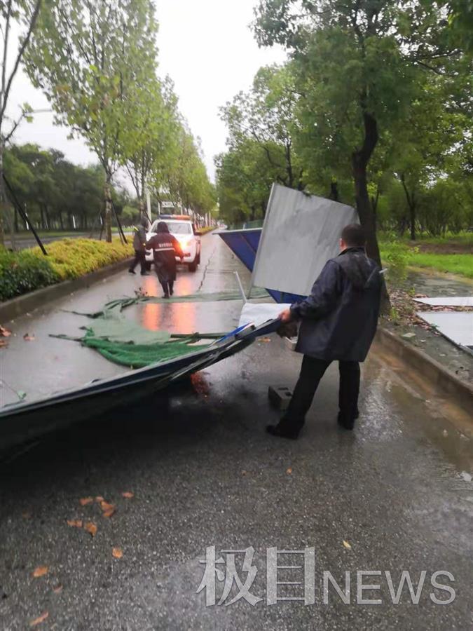 临空港大道、TCL对面20余块围挡倒塌,为了不影响通行安全,巡查的城管队员李祥凡、李黎、刘联红和彭程一一将倒塌的围挡扶起来。