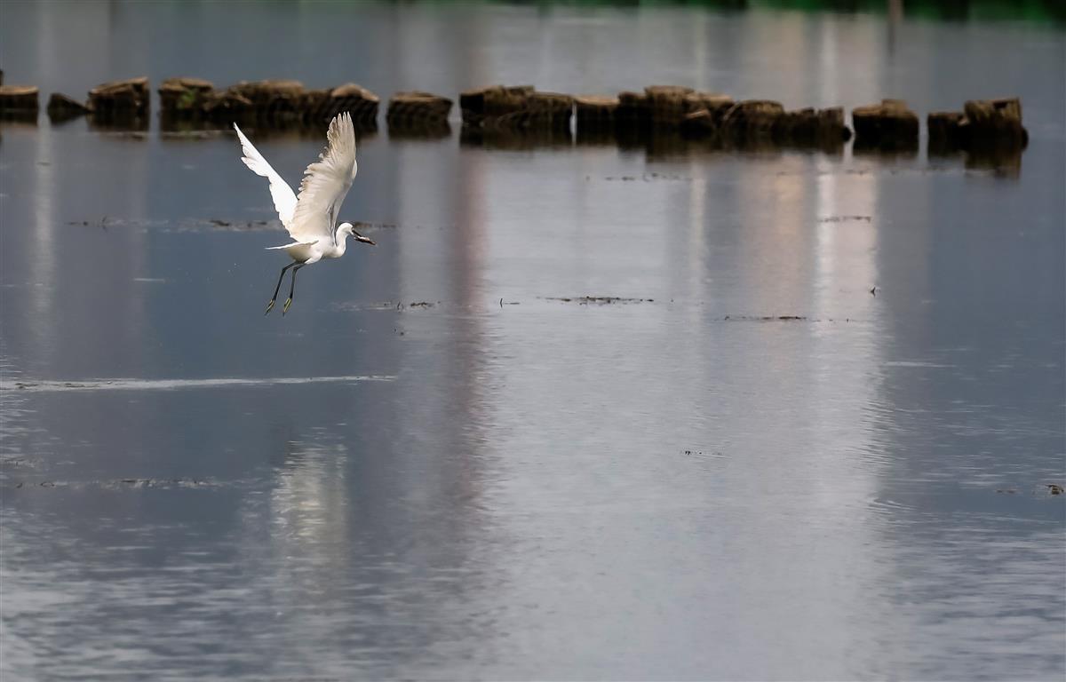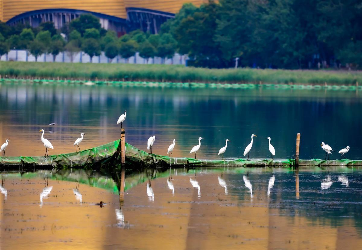 8月21日,在沙湖公园生态湿地区水域上,数百只鹭鸟集结,白色飞鸟在水面上嬉戏、捕食、飞翔,湖面一片喧闹景象。