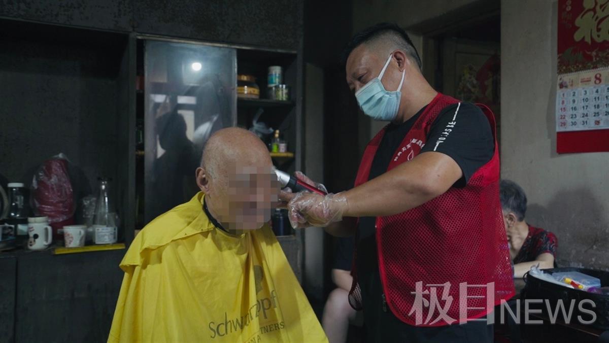 8月21日上午,志愿者李玲和杨森身着红马甲,拎着理发工具包和消杀防疫物品,来到了佟爹爹家中。“年轻人,请把我的头发都推光!”看着佟爹爹已长到一寸高的头发,当他说自己一直是光头时,李玲和杨森才知道,佟爹爹已经4个月没有理发了。