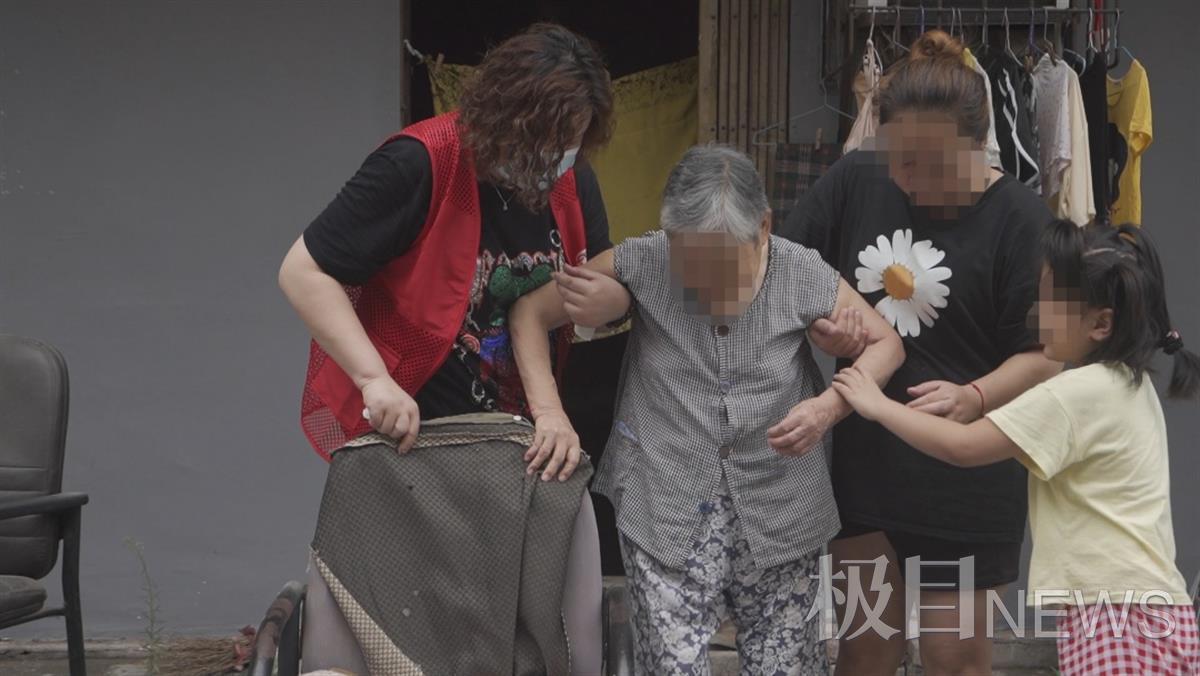 铺开地垫,摆好座椅,李玲和杨森又来到住在一楼的段婆婆家中。84岁的段婆婆腿部患有疾病,无法自主行走,段婆婆的女儿和李玲将老人搀扶到座椅上,杨森给老人系上围布,再次拿出了剃头剪。