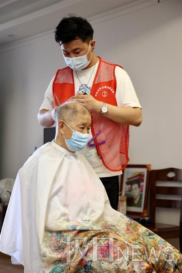 一手拿着剃头剪,一手拿着梳子,三下五除二,杨森重复着炉火纯青的理发手艺,一边理着发,一边跟佟爹爹聊着天,逗得老人直乐呵。10几分钟后,佟爹爹满头“不像个样子”的银发剃掉了,精神面貌焕然一新。