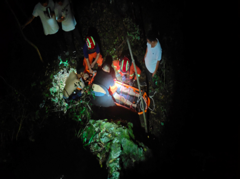 20分钟后,当消防救援人员下降到洞底时,终于发现坠落洞底的男子,但此时该男子呼吸微弱,身体多处受伤,尤其头部受伤严重,不能动弹,且意识渐模糊。考虑到人员受伤及现场地形情况,消防救援人员决定利用“双绳绳索救援系统”的方法实施救援,将三角救援吊带穿在被困人员身上,检查安全牢固后,消防救援人员利用救援三脚架制作五倍力系统,主绳提拉上升,副绳保护消防救援人员及被困人员,防止二次受伤。