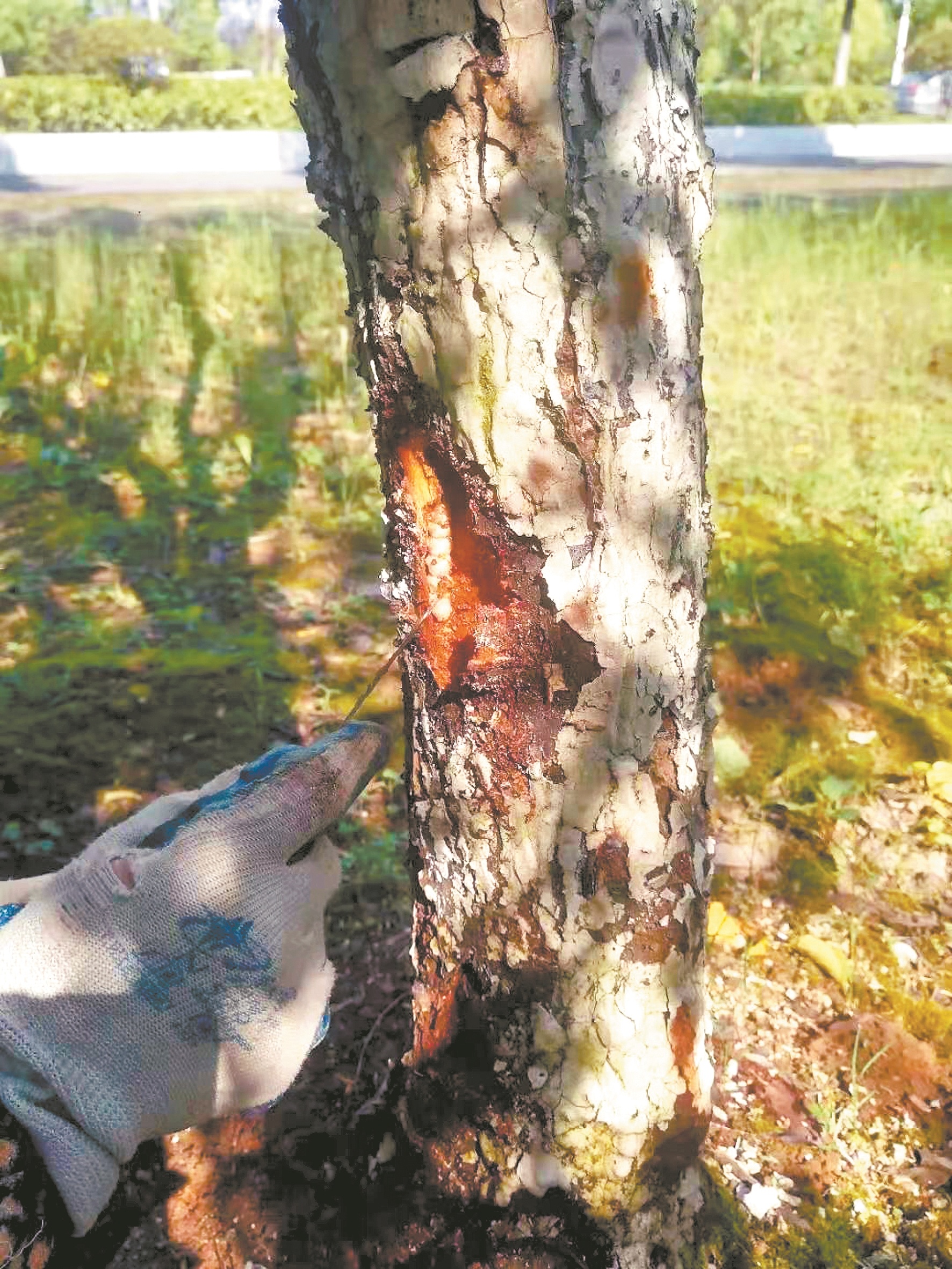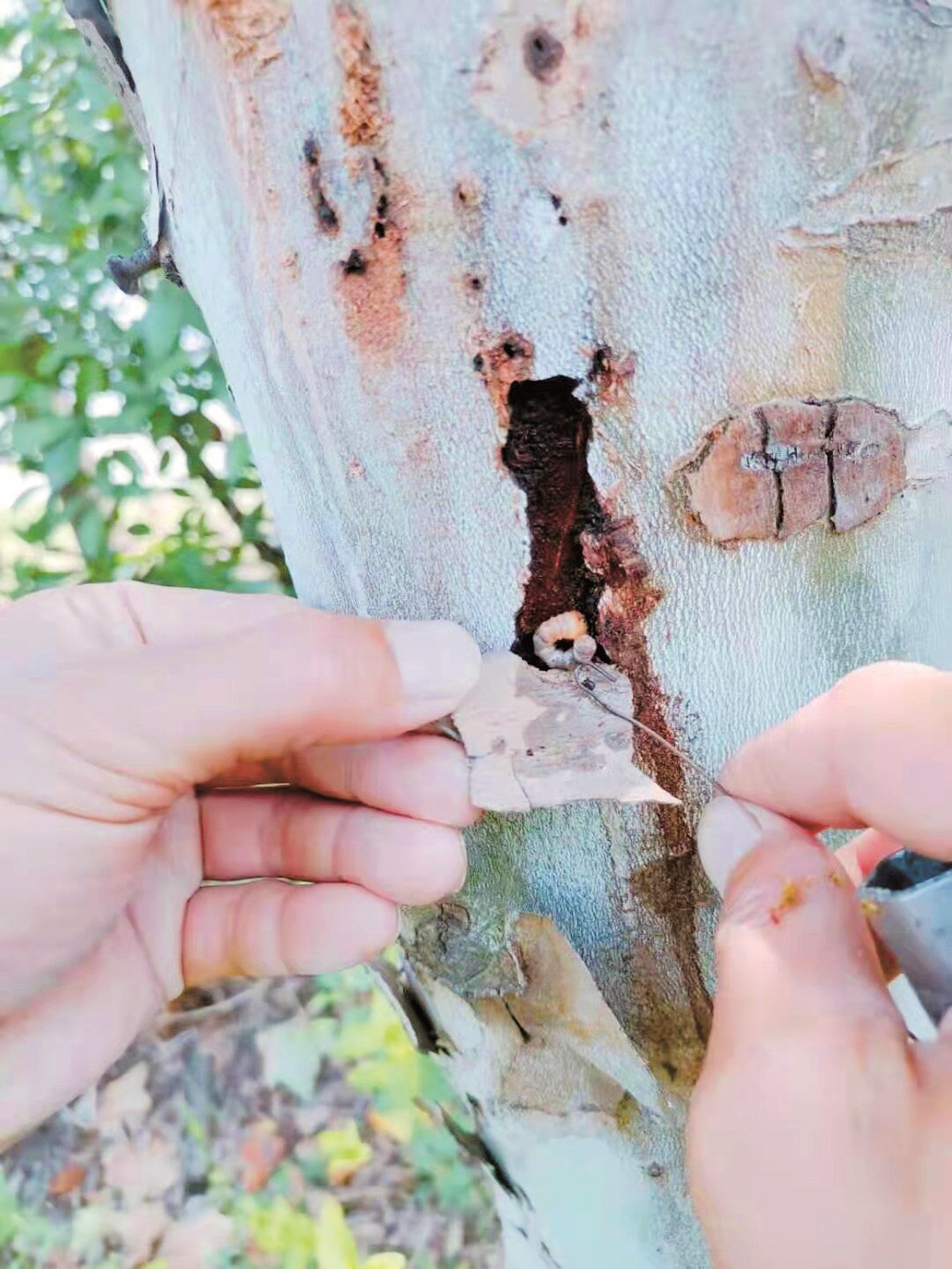 园艺师用螺丝刀破开树皮找天牛幼虫