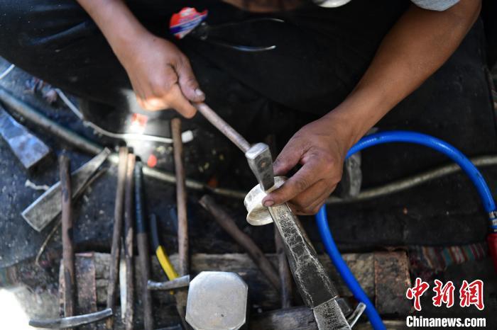 图为工人正在使用铁锤塑型。 贡嘎来松 摄