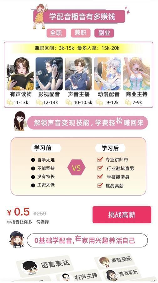 据介绍,整个课程为期4个月,期间会不定期发布配音征集信息,“学习过程中即可变现赚回学费。”