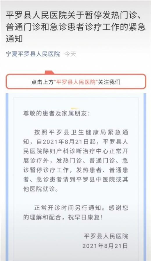 同日,患者马某某曾就诊过的平罗县人民医院也发布通知,21日起,该院除妇产科诊断治疗中心正常开展诊疗外,发热门诊、普通门诊、急诊暂停诊疗工作,发热患者、普通患者、急诊患者请到平罗县中医院或其他医院就诊。正常开诊时间另行通知。