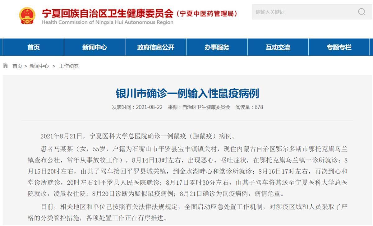 22日,宁夏回族自治区卫生健康委员会发布通报,鼠疫(腺鼠疫)确诊患者马某某(女,55岁,户籍为石嘴山市平罗县宝丰镇镇关村,现住内蒙古自治区鄂尔多斯市鄂托克旗乌兰镇查布公社,常年从事放牧工作)。