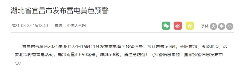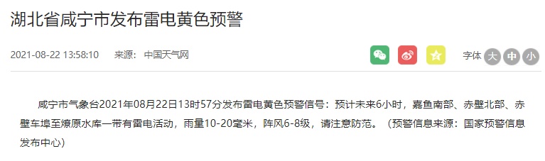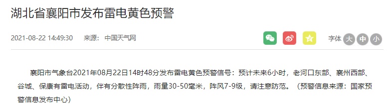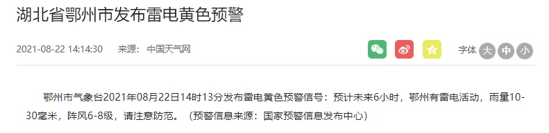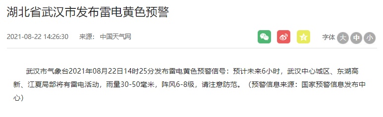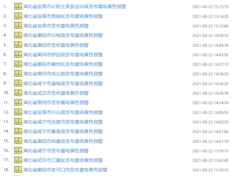 据湖北气象官网信息,自8月22日13时30分起,至15时15分,武汉、襄阳、宜昌、黄冈、鄂州、咸宁等地已连发多条雷电预警!提醒以上地区午后到傍晚注意防范雷阵雨!