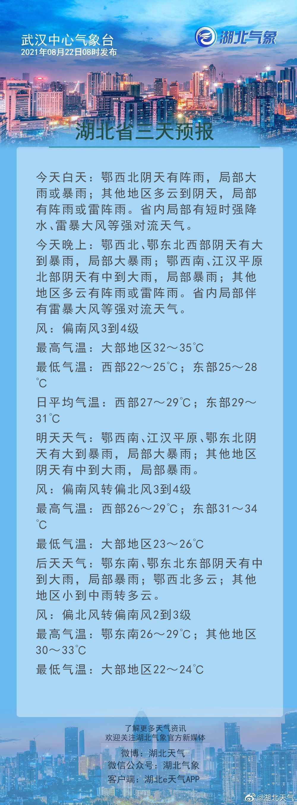 预计今天白天,鄂西北阴天有阵雨,局部大雨或暴雨;其他地区多云到阴天,局部有阵雨或雷阵雨。省内局部有短时强降水、雷暴大风等强对流天气。