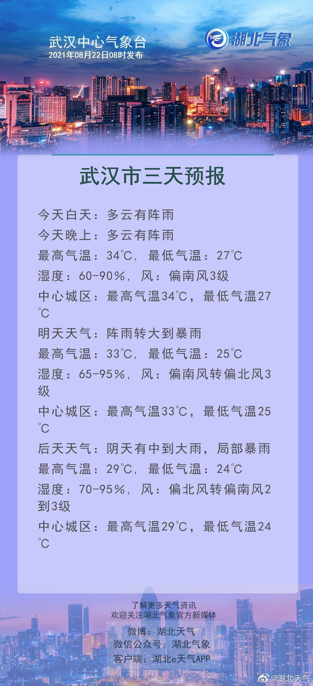 明天鄂西南、江汉平原、鄂东北阴天有大到暴雨,局部大暴雨;其他地区阴天有中到大雨,局部暴雨。