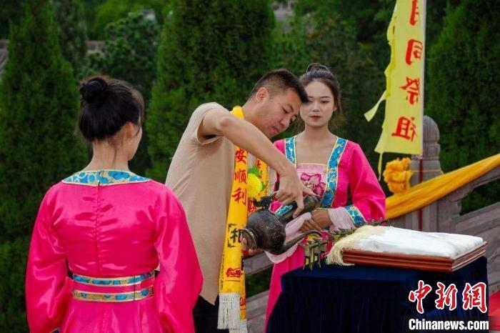洪洞大槐树祭祖大典进行“迎请神主”“敬香通神”“典帛安神”“敬献供品”等九项传统仪程。 洪洞大槐树景区供图