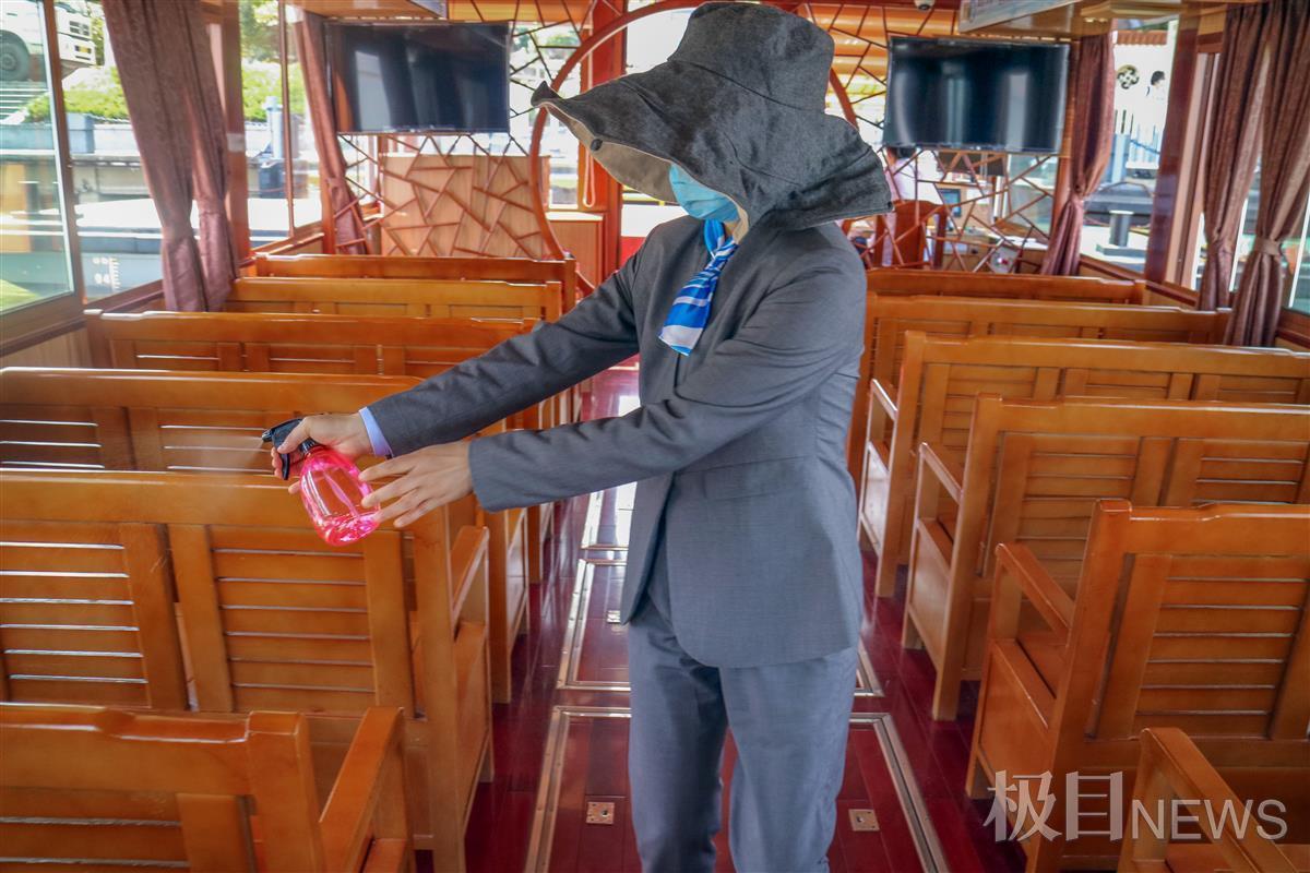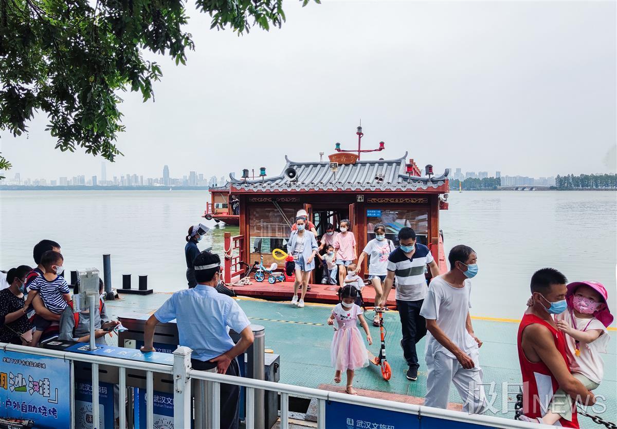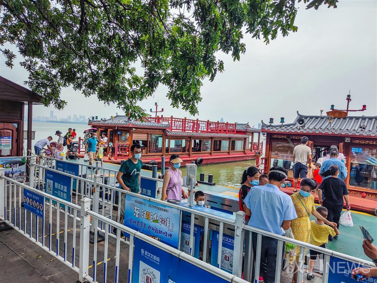 游船到达东湖磨山码头,待游人下船后,工作人员立即对船舱进行全面消杀;码头上候船、上下船的乘客,都能按防疫要求戴好口罩、出示健康码,接受体温测量。