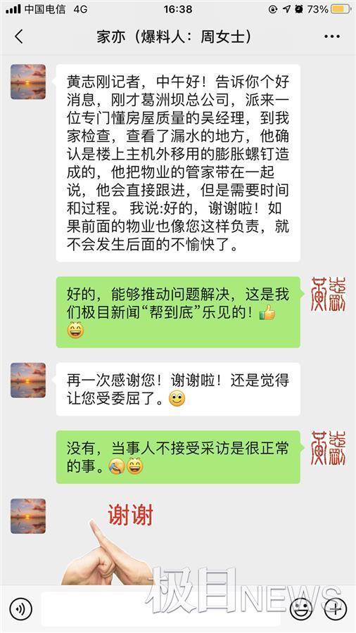 “感谢极目新闻的关注,物业经理已经上门沟通,并承诺漏水问题会管到底。” 8月22日,家住武汉市江汉区常青街葛洲坝国际广场的周女士再次致电极目新闻记者称,极目新闻“帮到底”栏目的《新房住了四年 墙面漏水两年》报道引起了上级物业公司的重视,已采取了初步的防水解决方案,并承诺墙面漏水问题会负责到底。