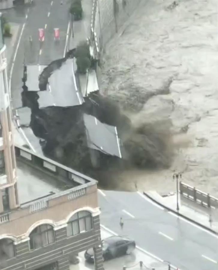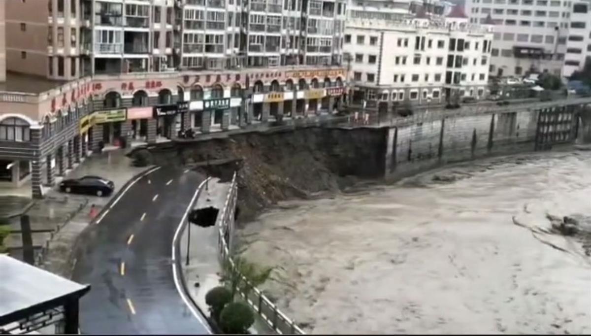 网传视频显示,浑浊的河水在河道中奔腾而下。突然,河畔一条河堤道路开始逐步垮塌。数秒钟之内,大块的路面和路基全部掉入河中被洪水冲走。视频显示,当时该道路并没有人行走。紧邻垮塌道路的,就是一个居民小区。