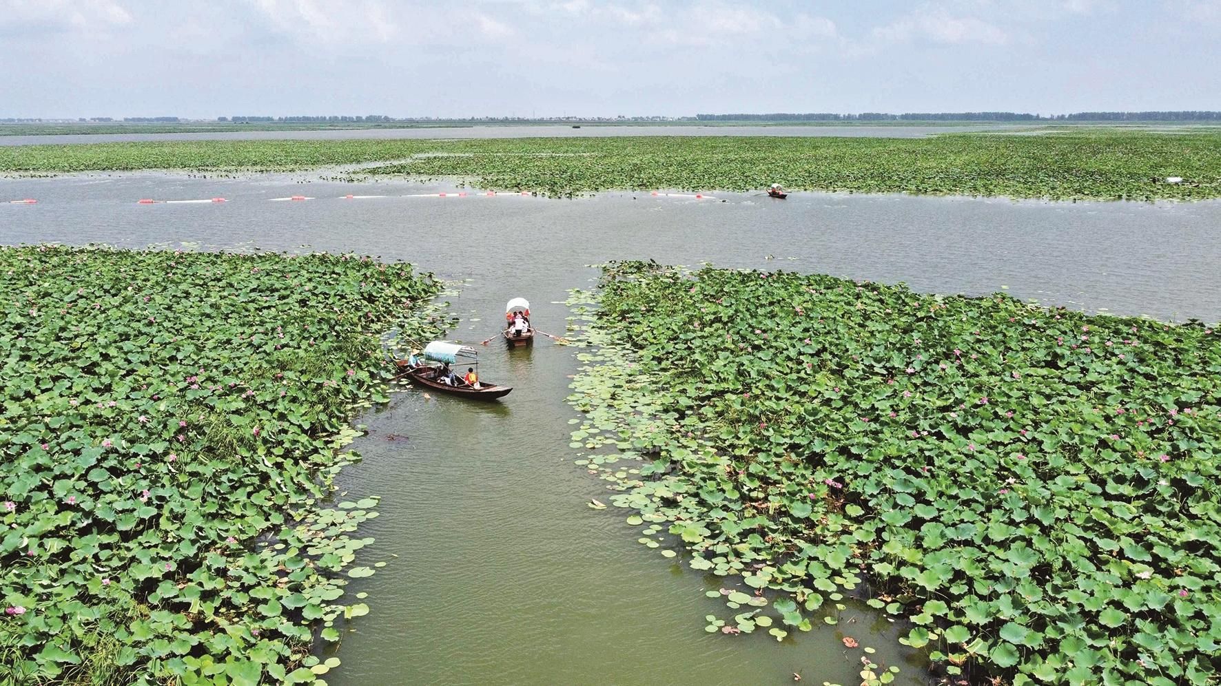 2019年12月,汈汊湖提前一年退垸还湖73050亩,拆除湖内围堤112万米。截至目前,湖内投放鱼苗100万尾,种植蒲草66万平方米,湖面比“三退”前扩大约30余倍,湖泊生态和相关功能大幅改善,汈汊湖调蓄洪能力大为增强,达到1.2亿立方米。