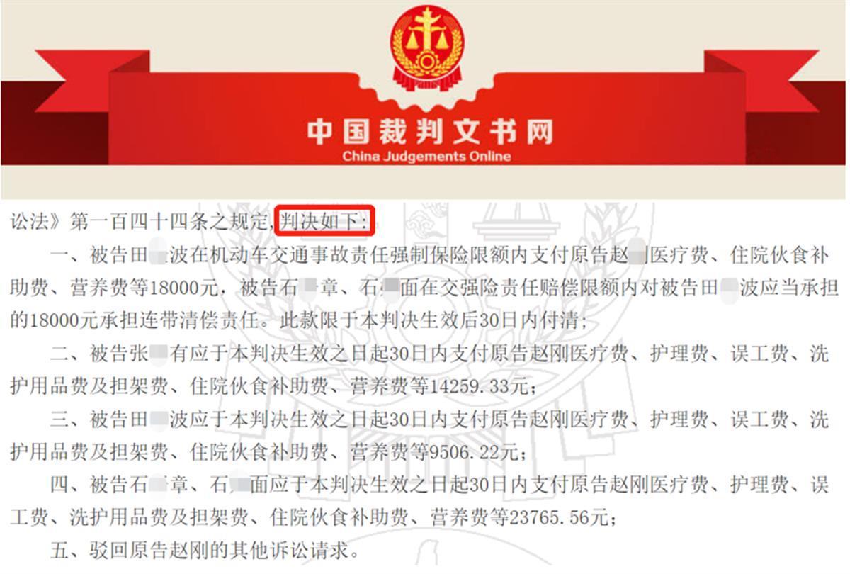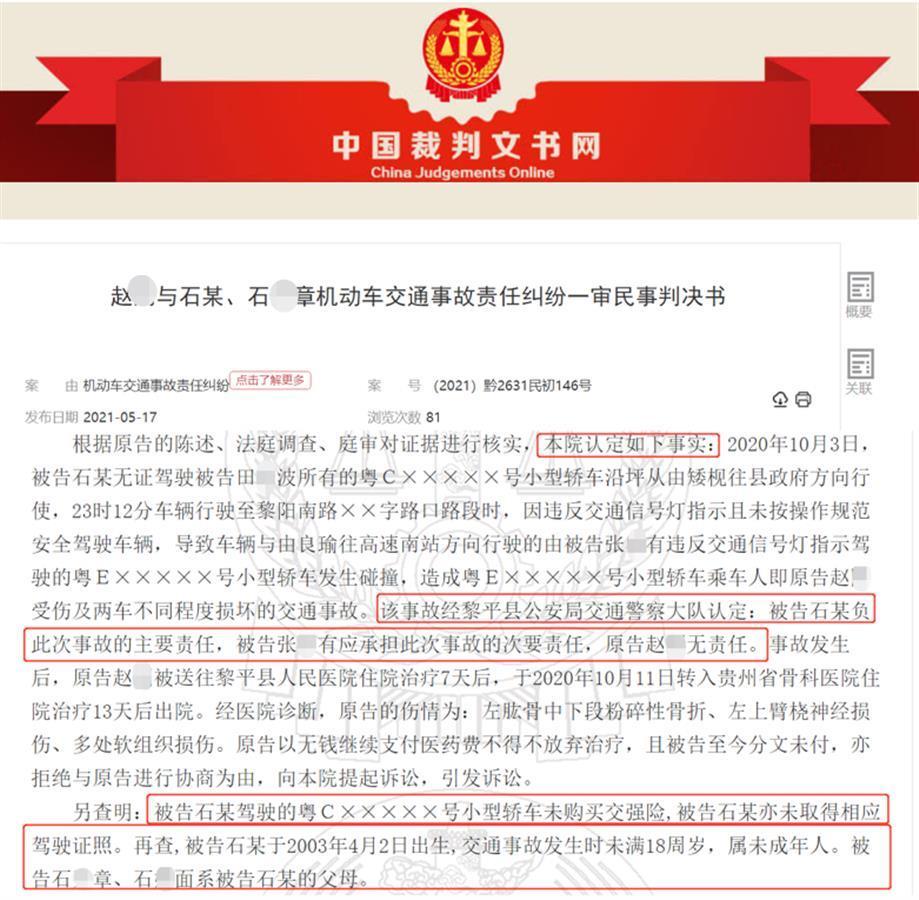 裁判文书网显示,贵州省黎平县人民法院于2021年3月25日对此案作出判决:该事故经黎平县公安局交通警察大队认定,被告石某香负此次事故的主要责任,被告张某有承担此次事故的次要责任,原告赵先生无责。