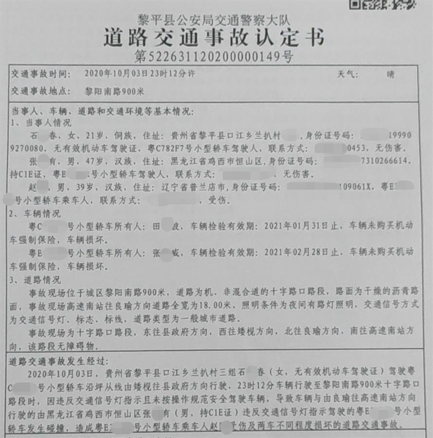 “2020年11月9日和11月25日,我分别收到了两份道路交通事故责任认定书,但两份认定书上,肇事女生的姓名等身份信息却不一样。”赵先生告诉极目新闻记者,11月9号的那份认定书上,事故主要责任人名叫石某春,年龄21岁。而11月25日的那份认定书上,事故主要责任人则变成了17岁的石某香。两份认定书上,均写明肇事女生是无证驾驶。