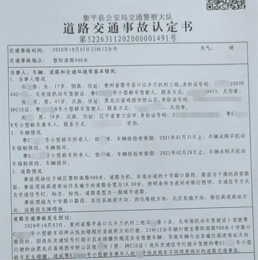 8月20日下午,贵州省黎平县人民法院执行庭夏姓工作人员告诉极目新闻记者,目前此案还在执行中,石某香目前刚满18岁,在外地打工,无钱赔偿。法院已经冻结了石某香的监护人石某章、石某面的银行账户,查封了赵先生所乘坐车辆的司机张某有名下车辆。