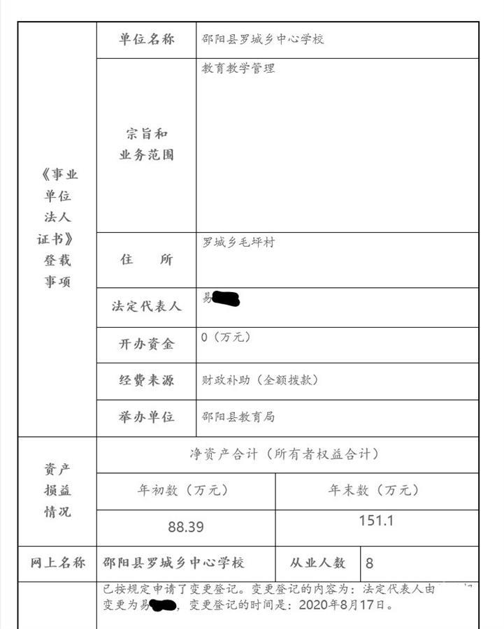 8月23日上午,极目新闻记者从邵阳县政府官网看到,罗城乡中心学校的主管单位为邵阳县教育局,经费来源为财政补助全额拨款,宗旨和业务范围在于教育教学管理。记者从相关渠道了解到,罗城乡中心学校是一个管理机构,管理该乡辖区内所有学校。2020年8月17日,易某成为该单位法定代表人。