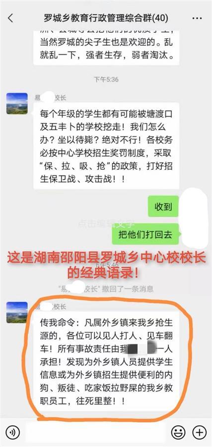 网传截图显示,在一个名为“罗城乡教育行政管理综合群”微信群中,易某发言称,每个年级的学生都有可能被邵阳县其他乡镇的学校挖走,因此不能坐以待毙。易某要求各校务必按中心学校招生奖罚制度,采取“保、拉、吸、抢”的政策,打好“招生保卫战”。