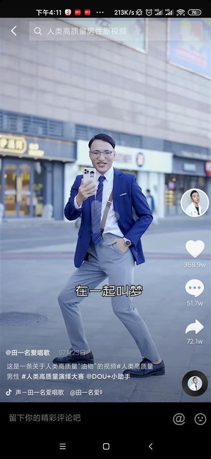 “就算只是做作也只是怕错过……”视频中的田一名效仿徐勤根梳着二八分的油头,身着精致的西装放肆歌舞。也因此,田一名在入驻短视频平台2年后,迎来了自己的爆红。