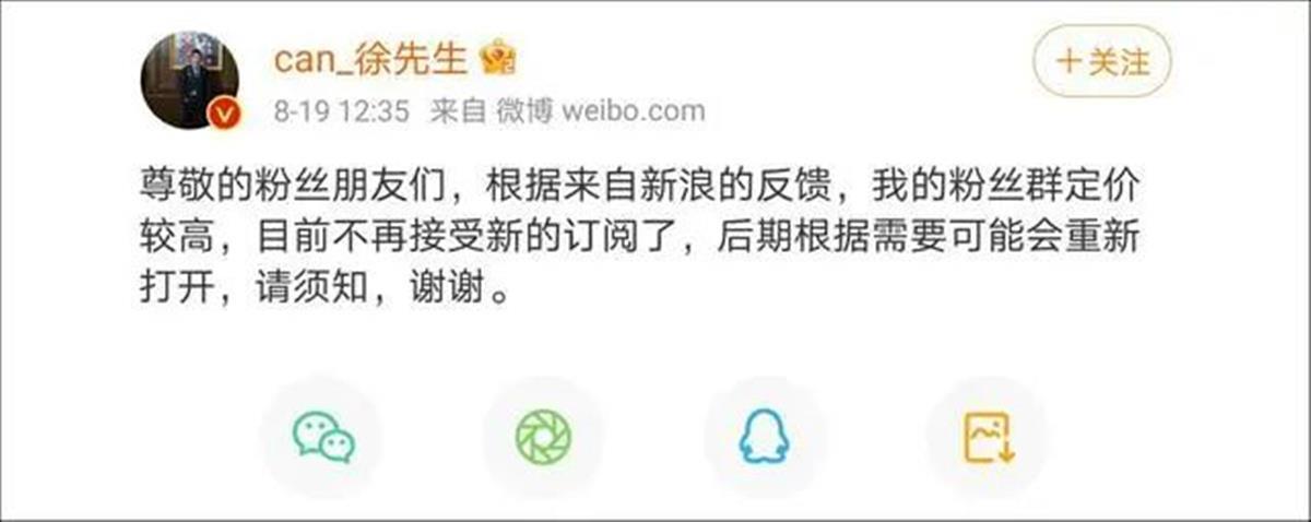 徐勤根微博表示不再接受粉丝群定阅 (来源:网络)