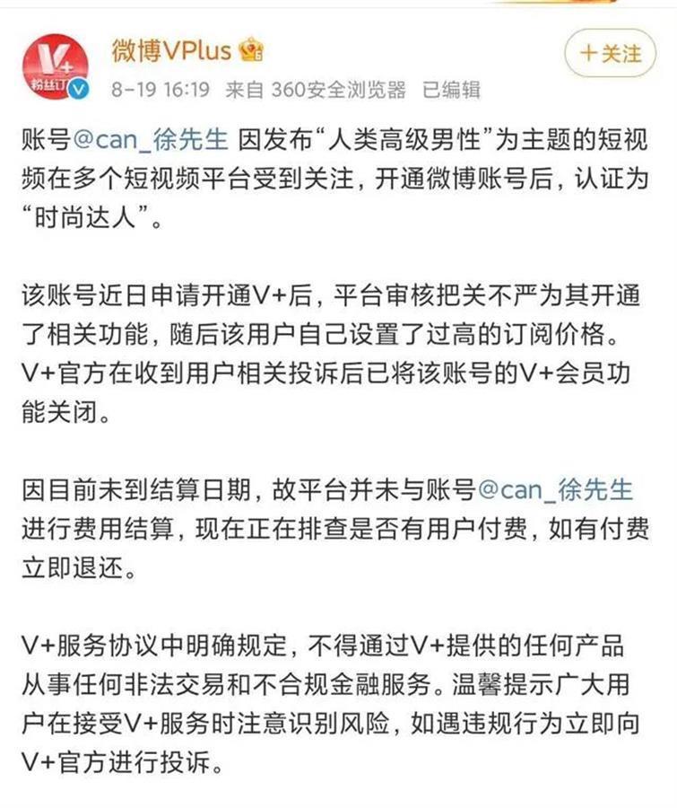 随后新浪微博官方回应称,由于徐勤根没有金融资质认证,且违反“不得通过V+服务(开通粉丝群)从事任何产品的非法交易和不合规金融服务”的规定,已经将该博主粉丝群功能关闭,所有订阅费用将退回给用户个人。