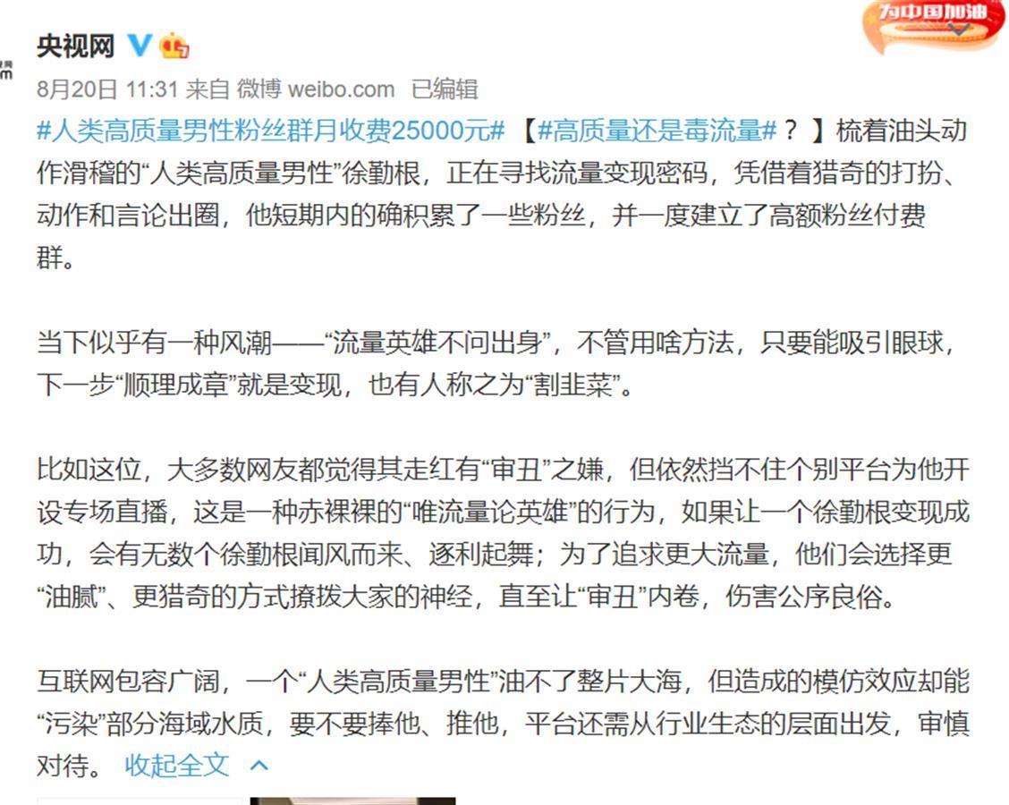 8月20日,央视网发布评论称,大多数网友都觉得其走红有“审丑”之嫌,但依然挡不住个别平台为他开设专场直播,这是一种赤裸裸的“唯流量论英雄”的行为,如果让一个徐勤根变现成功,会有无数个徐勤根闻风而来、逐利起舞;为了追求更大流量,他们会选择更“油腻”、更猎奇的方式撩拨大家的神经,直至让“审丑”内卷,伤害公序良俗。互联网包容广阔,一个“人类高质量男性”油不了整片大海,但造成的模仿效应却能“污染”部分海域水质,要不要捧他、推他,平台还需从行业生态的层面出发,审慎对待。