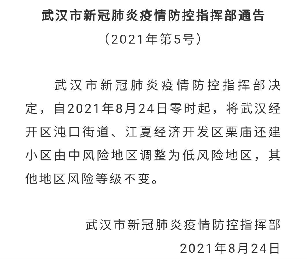 8月24日,武汉市新冠肺炎疫情防控指挥部决定,自2021年8月24日零时起,将武汉经开区沌口街道、江夏经济开发区栗庙还建小区由中风险地区调整为低风险地区,其他地区风险等级不变。