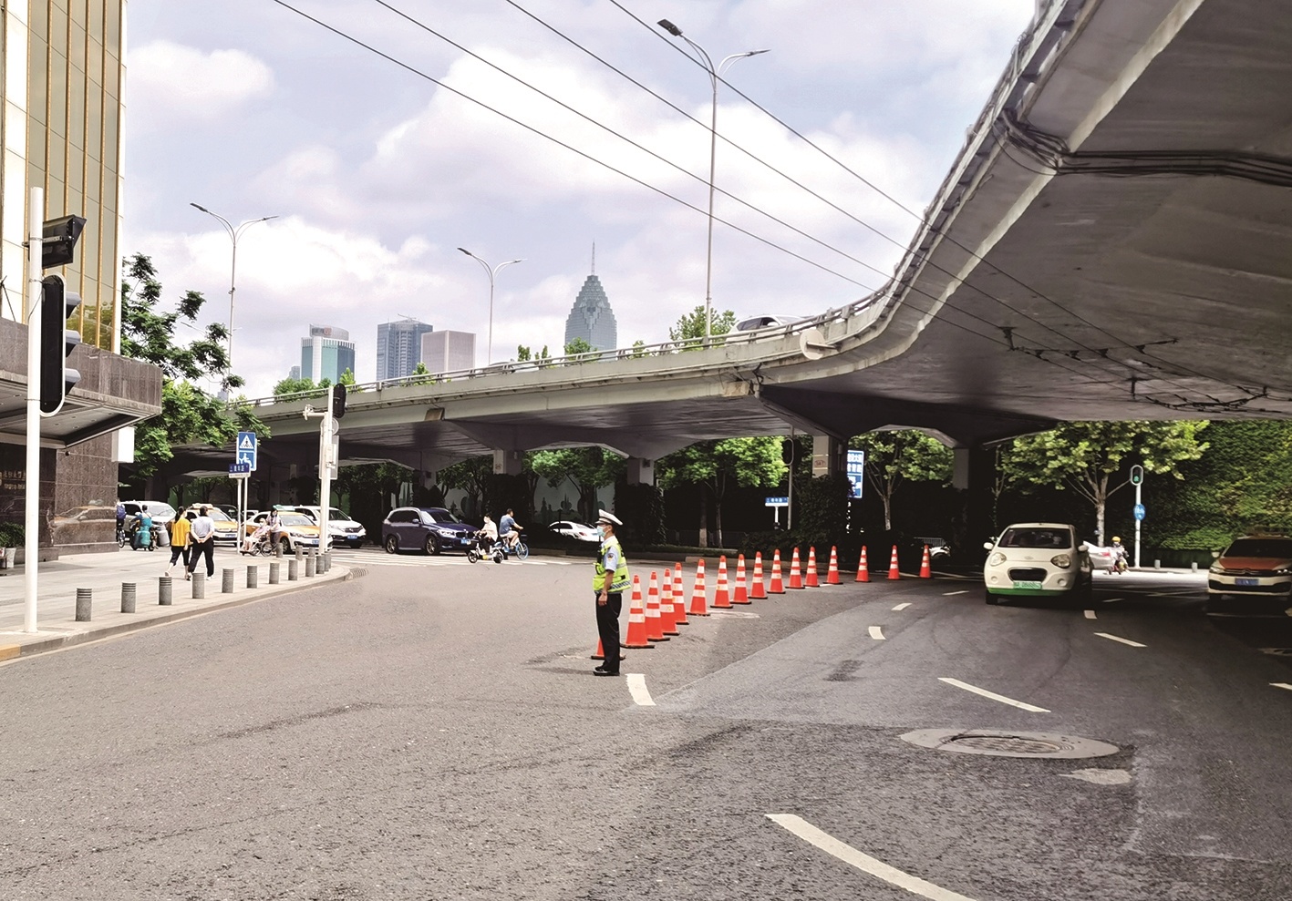8月23日早上7时,硚口交通大队6名交警、8名辅警早早来到航空路一层环岛执勤。此时,前往同济医院候诊的排队车辆已经排过了公交车站。7时15分,车流明显增大,早高峰来了。青年路右转往西的车流量密集,由于青年路方向的车流不能直行通过环岛,也要右转调头,为了减少西向的通行压力,江汉区交通大队在青年路加派了警力,引导直行往武胜路方向的车流上高架通行。