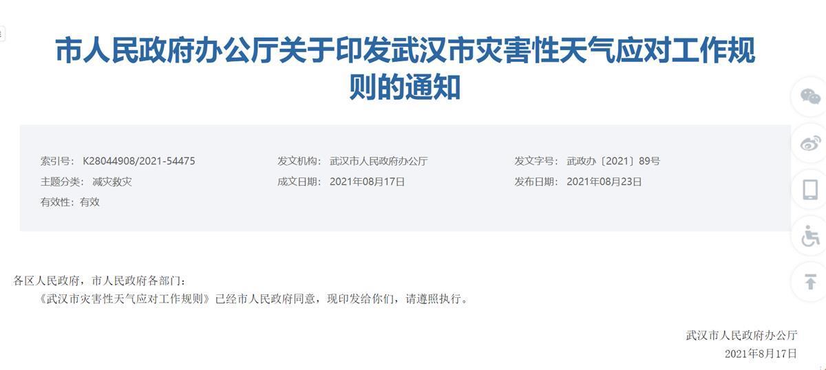 8月23日,《武汉市灾害性天气应对工作规则》在武汉市政府官网公布。武汉市规定,大风、雷电等黄色预警期间,施工单位要停止塔吊、脚手架、玻璃幕墙清洗等高空户外危险作业。遇突发严重危及行车安全的情况,城市轨道交通等公共交通运输工具驾驶员、车站行车人员可以先行采取紧急安全防护措施(含停止运行、疏散乘客等),再按照规定报告。