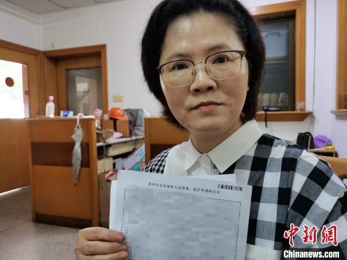 古祝瑛展示自己的《苏州市企业退休人员养老、医疗待遇核定表》。 钟升 摄