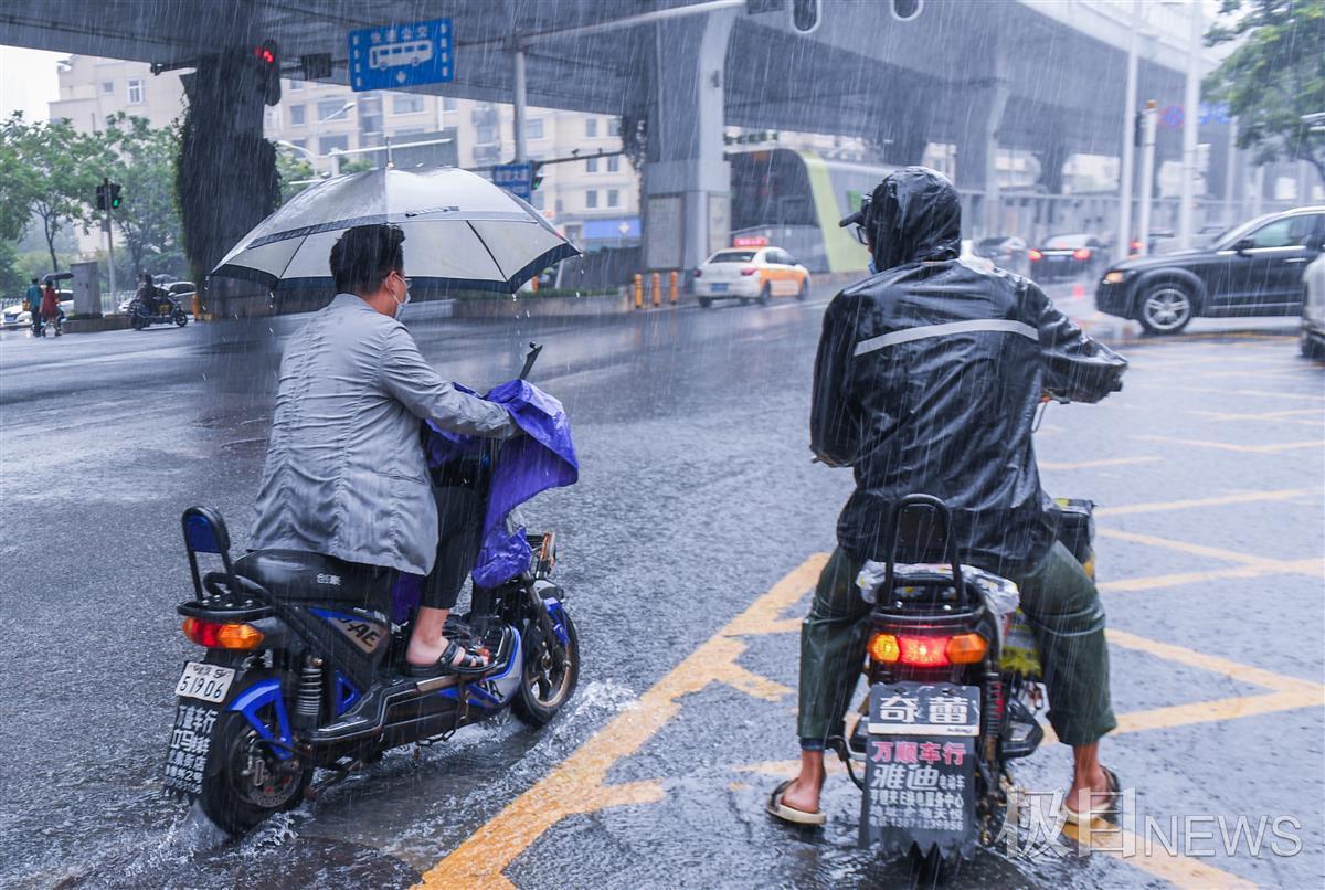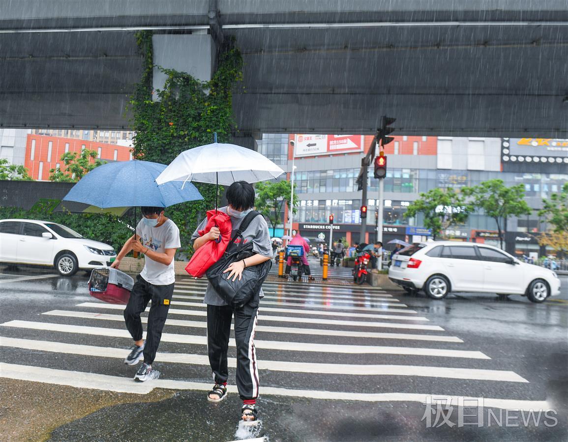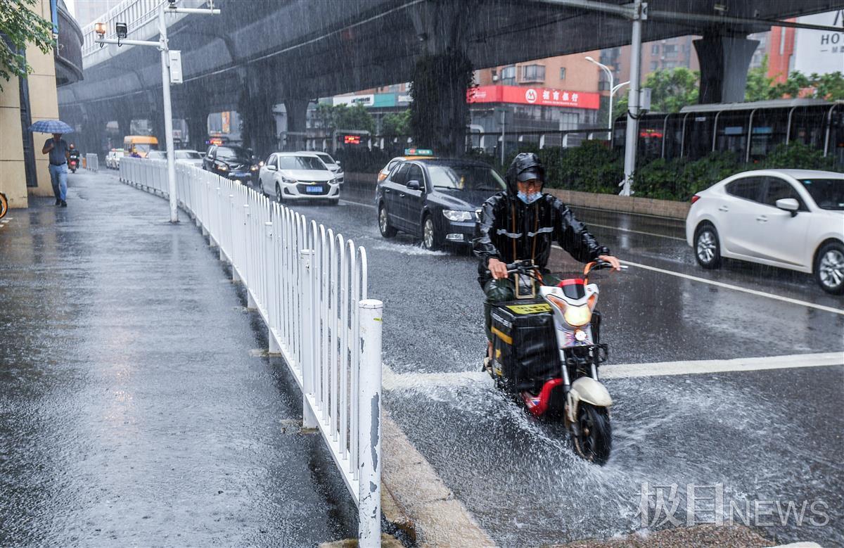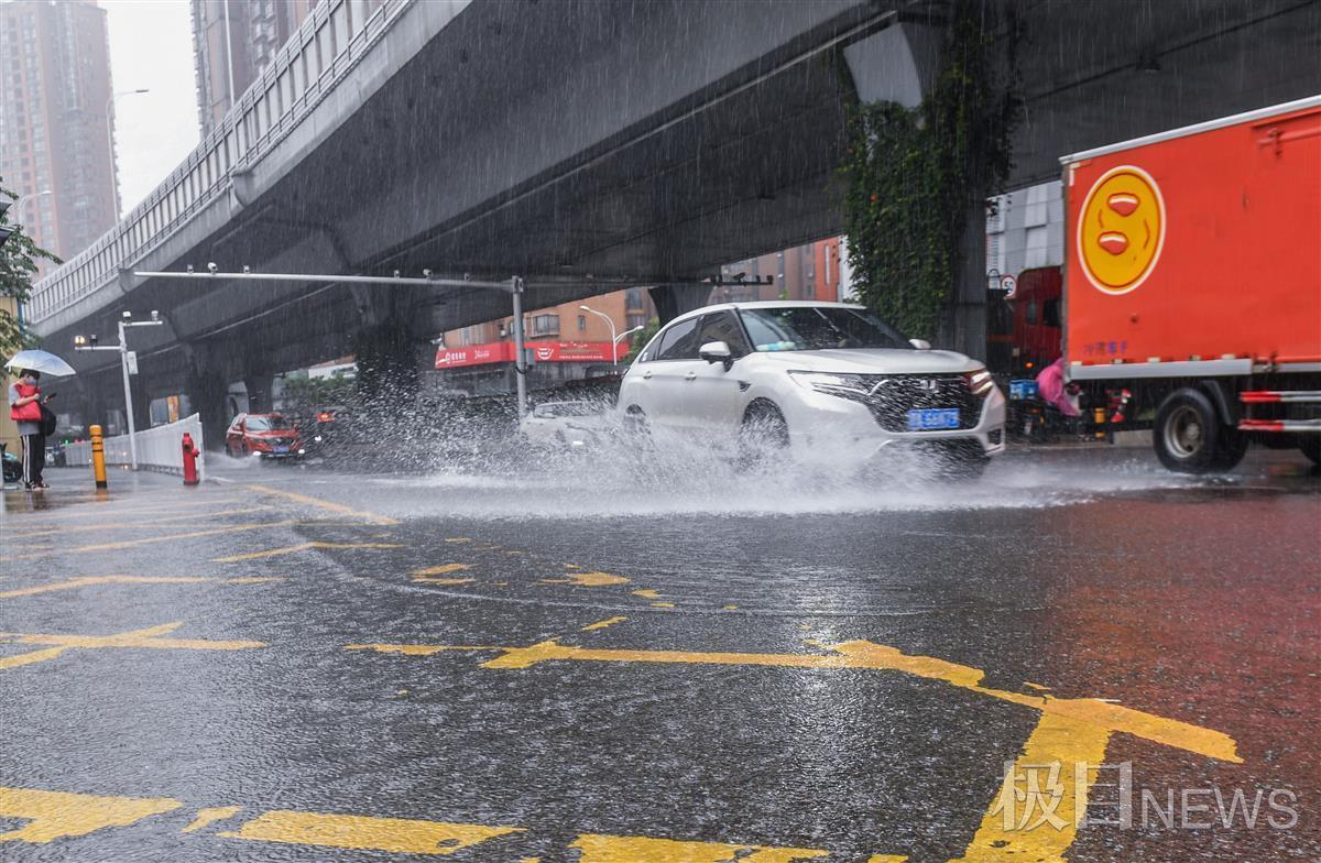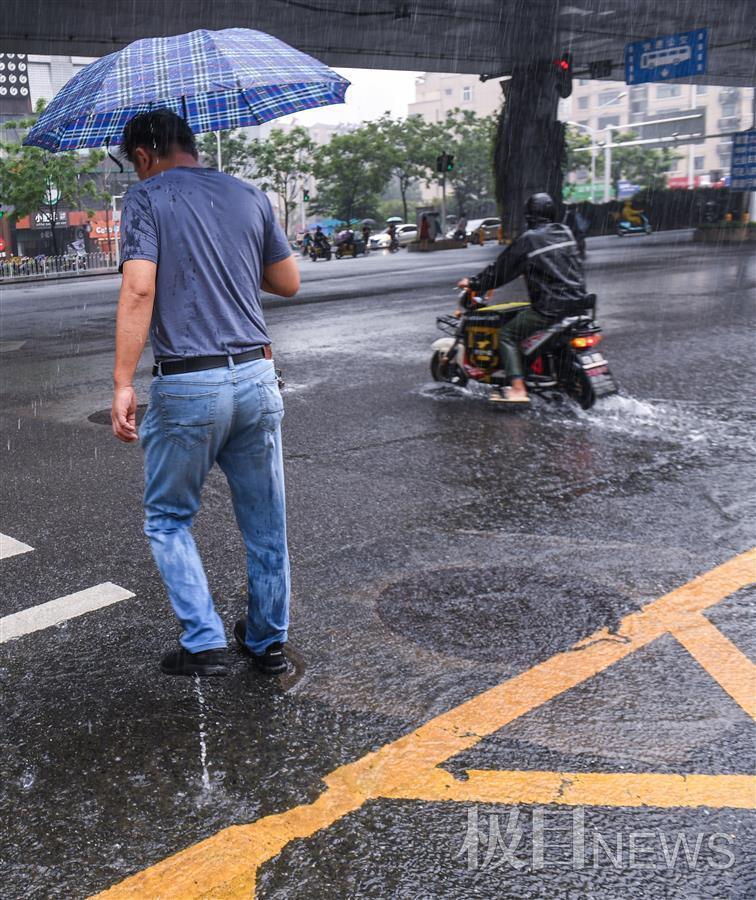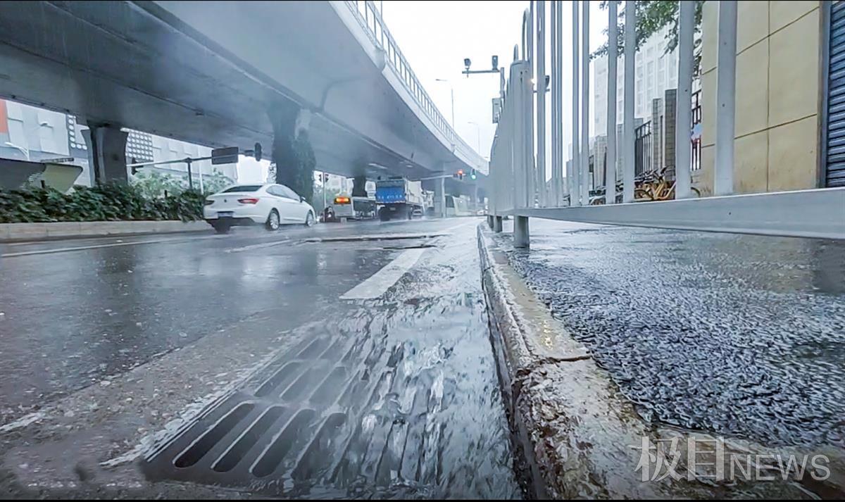 大雨给行人带来不便,有效的路面排水,没有因积水阻断人们前行(雄楚大道)