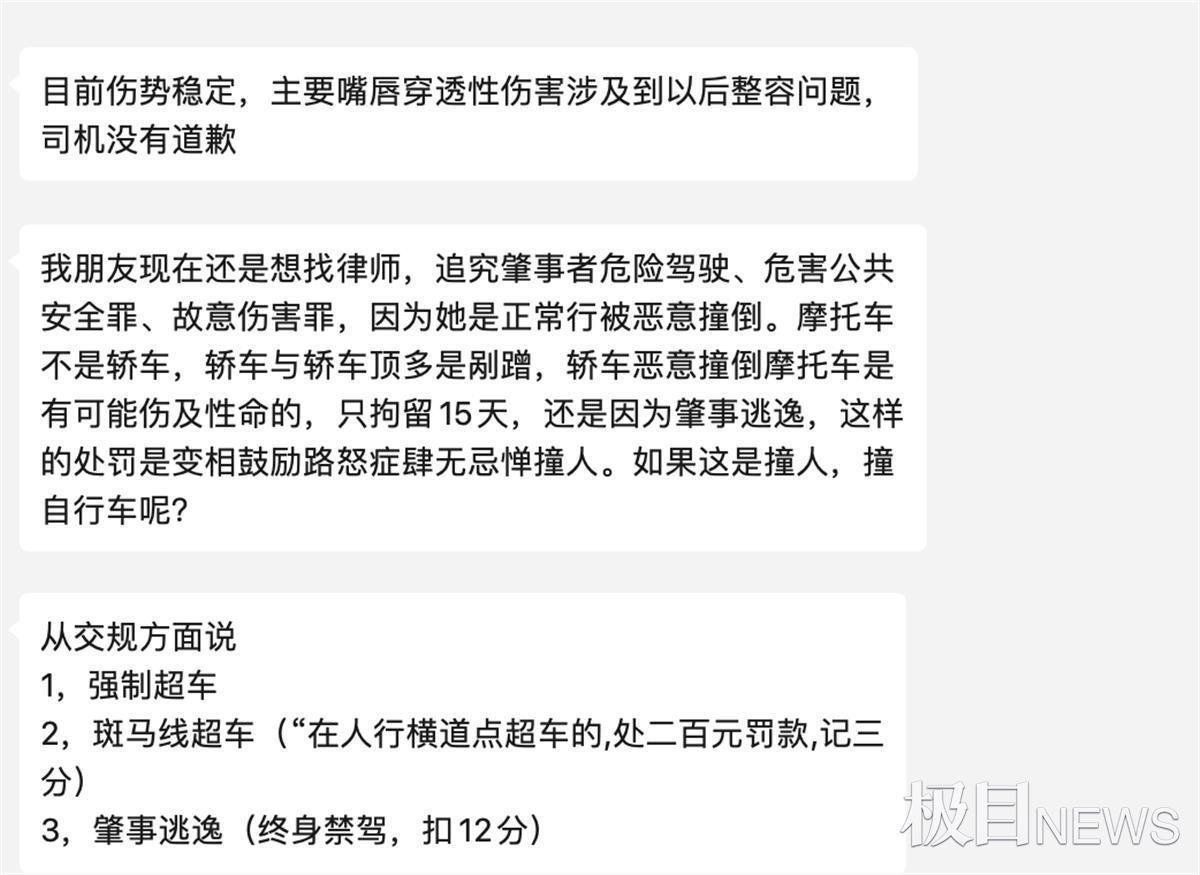 “我朋友现在还是想找律师,追究肇事者责任。因为她是正常行驶却被撞倒。摩托车不是轿车,轿车与轿车顶多是剐蹭,轿车撞倒摩托车是有可能伤及性命的,最后轿车还肇事逃逸。”郝先生说。
