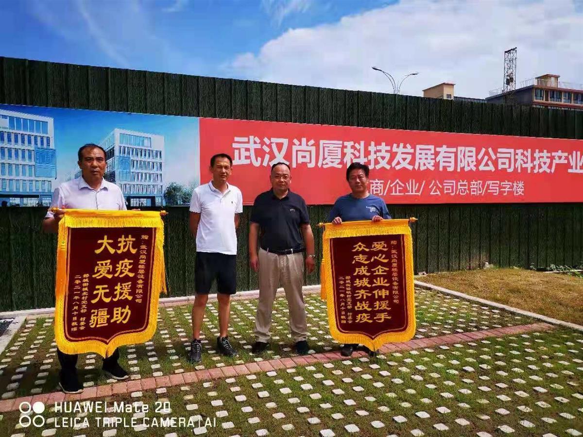 8月24日上午,邾城街城北工业园尚厦公司惊喜地收到两面锦旗,锦旗上分别写着“抗疫援助、大爱无疆”和“爱心企业伸援手、众志成城齐抗疫”,这是经济发展办公室、城北村及骆畈村相关负责人特意为感谢尚厦公司对邾城街全员核酸检测工作大力支持送来的锦旗。