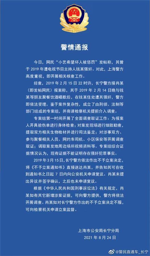 8月24日23时30分,上海市公安局长宁分局发布警情通报,通报中提到,针对网民“小艺希望坏人被惩罚”发帖举报主持人钱枫在2019年2月14日对其强奸一事,长宁警方曾在第一时间成立了由刑侦、法制等部门组成的专案组,并商请检察机关提前介入调查。