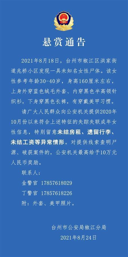 极目新闻记者看到,台州市公安局椒江分局于8月24日发布的通报显示,8月18日,警方在台州市椒江区洪家街道兆桥小区发现一具未知名女性尸体。该女性参考年龄30岁至40岁,身高160厘米左右,上身外穿蓝色绒毛外套、内穿黑色半高领针织衫,下身穿黑色长裤,有穿戴美甲习惯。