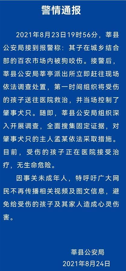 随即,莘县公安局组织深入开展调查,全面搜集固定证据,对肇事犬只的主人孟某依法采取措施。目前,受伤的孩子正在医院接受治疗,无生命危险。