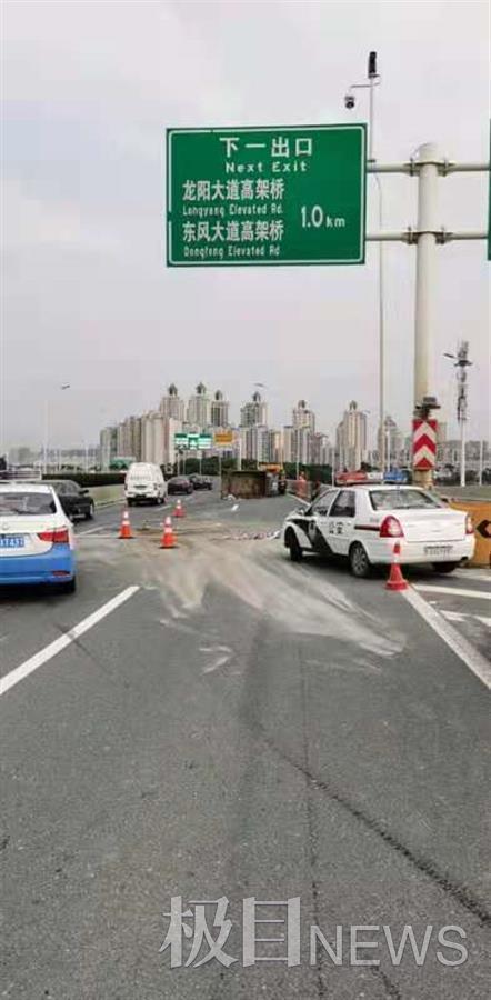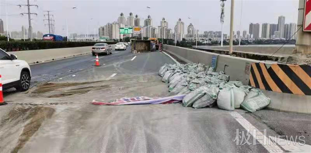 8月24日下午,一辆货车在东风高架路段突然侧翻,散落的水泥包堵塞了桥面交通,白沙洲大桥交警连忙搬运清理,及时疏通道路,避免了大面积交通堵塞。
