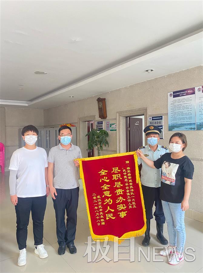 8月24日上午,辛先生将一面印有“尽职尽责办实事,全心全意为人民”的锦旗送到城管执法人员手中。辛先生说,其实之前自己也联系过相关部门,一直没有得到切实解决。但向城管部门反映后,城管工作人员真诚、耐心地倾听并帮助解决这个问题,是真正意义上的“民有所呼,我必有应”。