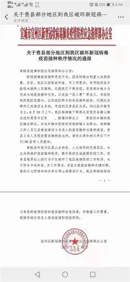 8月24日,网传一则《关于贵县部分地区到我区破坏新冠病毒疫苗接种秩序情况的通报》文件,该文件落款为宣城市宣州区疫情防控应急指挥部办公室。这则文件称,近期宣州区干群发现,芜湖市南陵县部分地方为完成本地疫苗接种任务,以发放“误工费”等名义,有组织地到宣州区范围内,拉送该区群众到南陵县接种疫苗。且此类事件已连续发生多起。