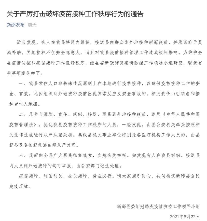 8月22日,邵阳新邵县疫情防控工作领导小组发布的类似通告称,凡参与策划、宣传、组织、接送、联系到外地接种疫苗,扰乱该县疫苗接种工作秩序的人员,一经发现,由县公安机关牵头按照相关法律法规进行从严从重处罚。属该县机关事业单位特別是各医疗机构工作人员的,由县纪委监委依纪依法依规从严处理。