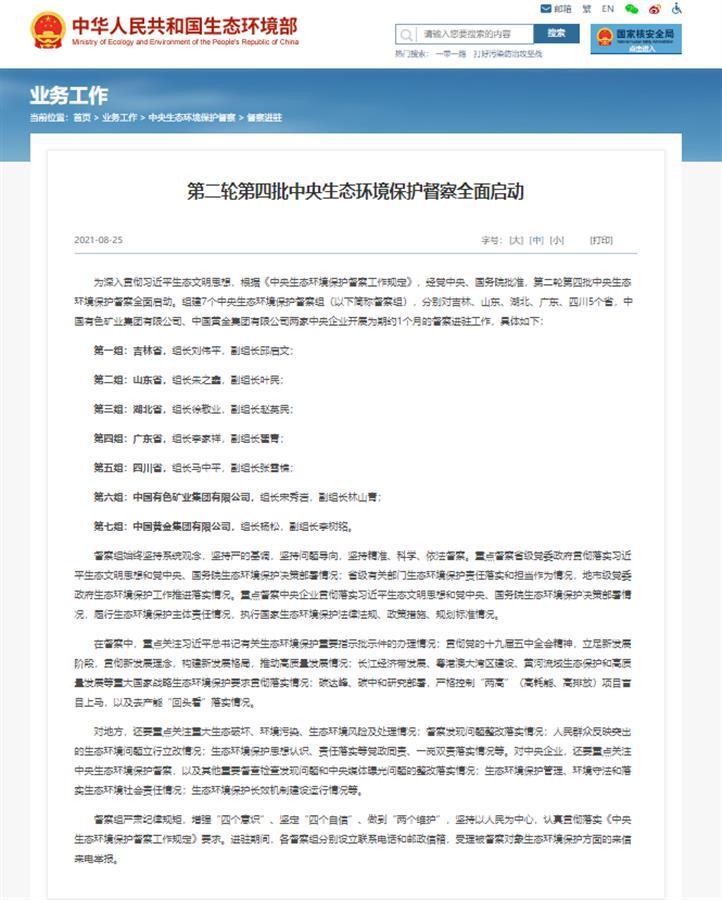 据生态环境部消息,根据《中央生态环境保护督察工作规定》,经党中央、国务院批准,第二轮第四批中央生态环境保护督察全面启动。生态环境保护督察组建7个中央生态环境保护督察组(以下简称督察组),分别对吉林、山东、湖北、广东、四川5个省,中国有色矿业集团有限公司、中国黄金集团有限公司两家中央企业开展为期约1个月的督察进驻工作,具体如下: