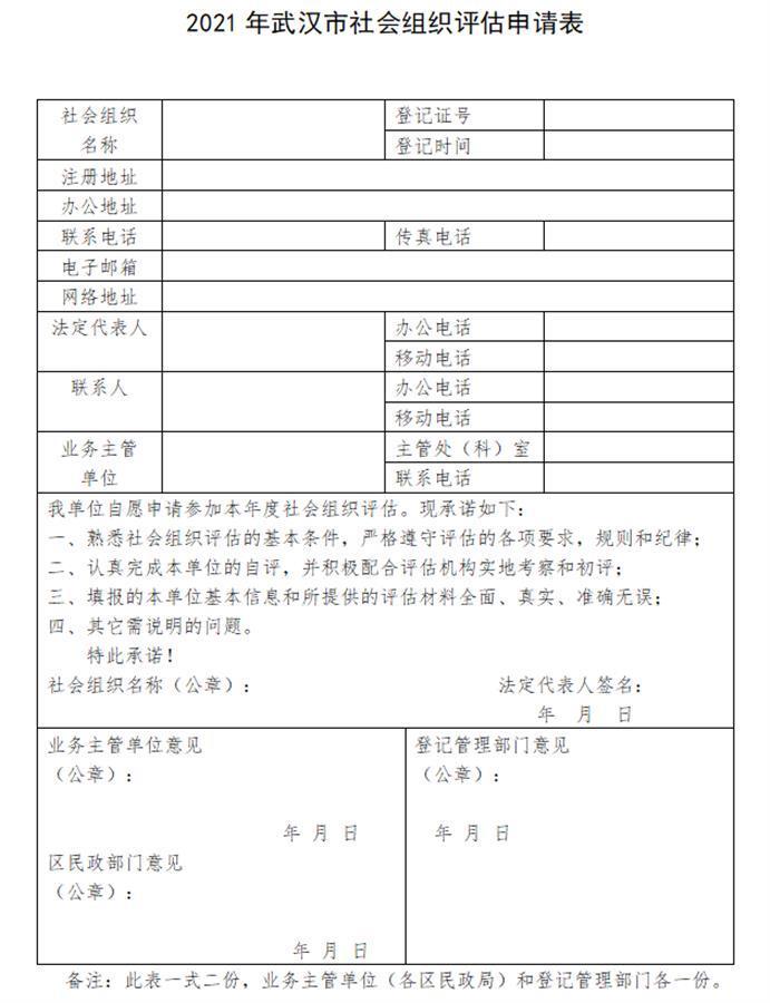 自愿参加评估的武汉市级社会组织填写《2021年武汉市社会组织评估申请表》后,经业务主管单位初审后,报送武汉市社会组织管理局;武汉市民政局直管的市级社会组织填写《申请表》后,直接报送市社会组织管理局;下放到各区的市级社会组织填写《申请表》后,经业务主管单位和各区民政局初审,报送市社会组织管理局。