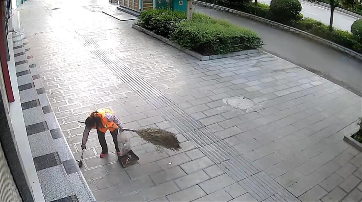事发云南省昭通市鲁甸县一五金店铺门口。店铺门前的监控视频显示,8月24日上午7时许,一名环卫工人正在清扫店铺门前的人行道,其间发现地上有一只活老鼠。于是,她用手中的火钳将老鼠夹住,将它丢到了店铺门口。