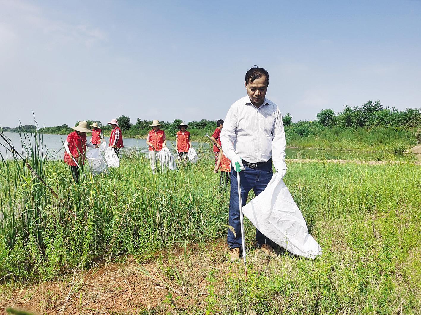 梁子湖区民间“河湖长”邱泽鹏带着志愿者在湖畔义务巡拾垃圾。(通讯员 胡倩 摄)