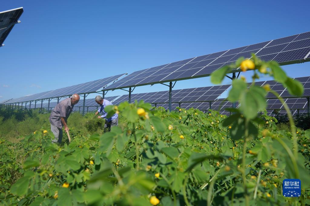 8月25日,在内丘县五郭店乡中田庄村“农光互补”光伏发电项目旁,村民在管护农作物。