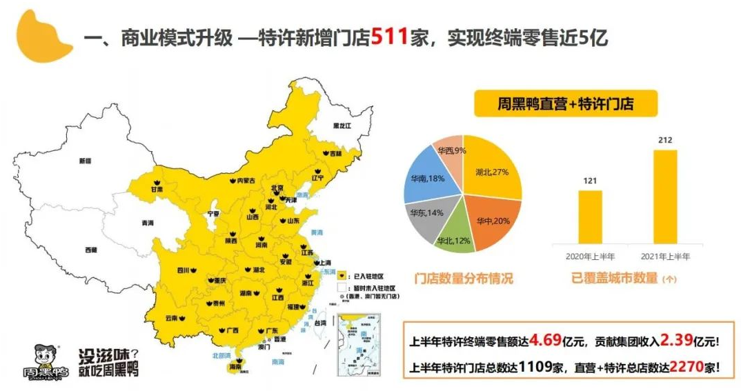 上半年数据显示,周黑鸭门店总数为2270家。其中,直营门店1161家,特许经营门店1109家,几乎各占半壁江山。