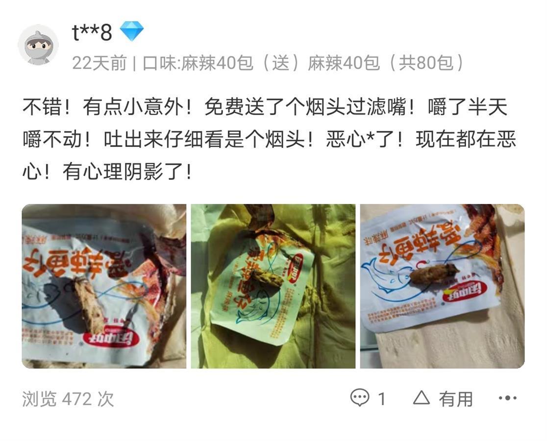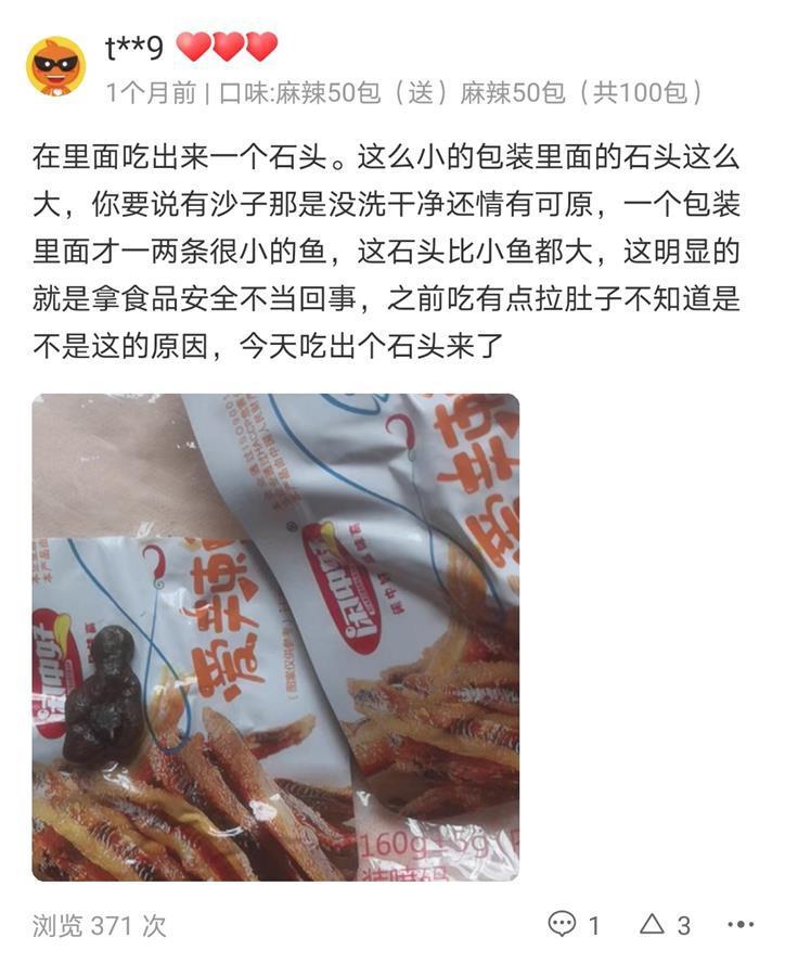 小鱼干零食的包装显示,该产品“闲中好爱辣鱼仔”,配料包括鱼干、酵母抽提物等。极目新闻记者在郭先生购买的商品评价中看到,有不少购买者也反映吃出小石子、烟头、塑料片等异物。
